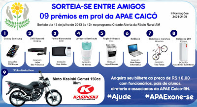 Encerrando as comemorações alusivas aos 43 anos de sua fundação, a Associação de Pais e Amigos dos Excepcionais – APAE Caicó-RN, promoverá um Jantar Beneficente no próximo sábado, 09 de abril, a partir das 19 horas no clube Pingo D’água onde toda a renda será destinada para a referida instituição.
